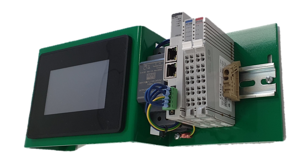 - Programmable I/O Light Version With Codesys in compact size, mounted on a flexible metal frame with power supply and 4,3” HMI